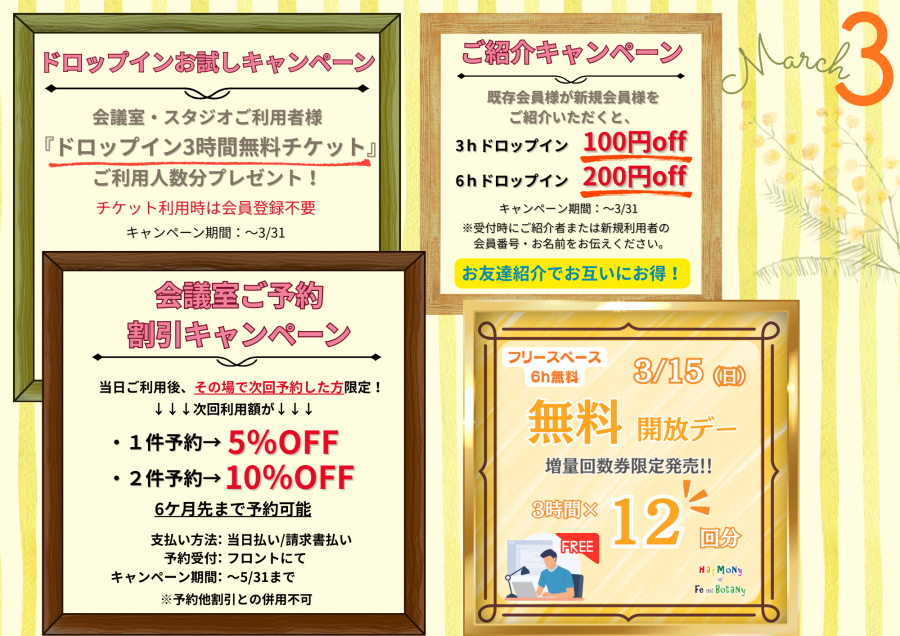 期間中、会議室またはスタジオをご利用いただいた皆様へ、「ドロップイン3時間無料チケット」をご利用人数分プレゼントいたします!